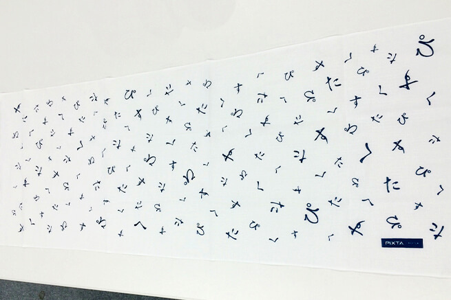 ひらがながバラバラに配置されたハイセンスなオリジナルデザインはお客様からご入稿頂き、それを元に顔料プリントでお仕上げさせて頂きました。